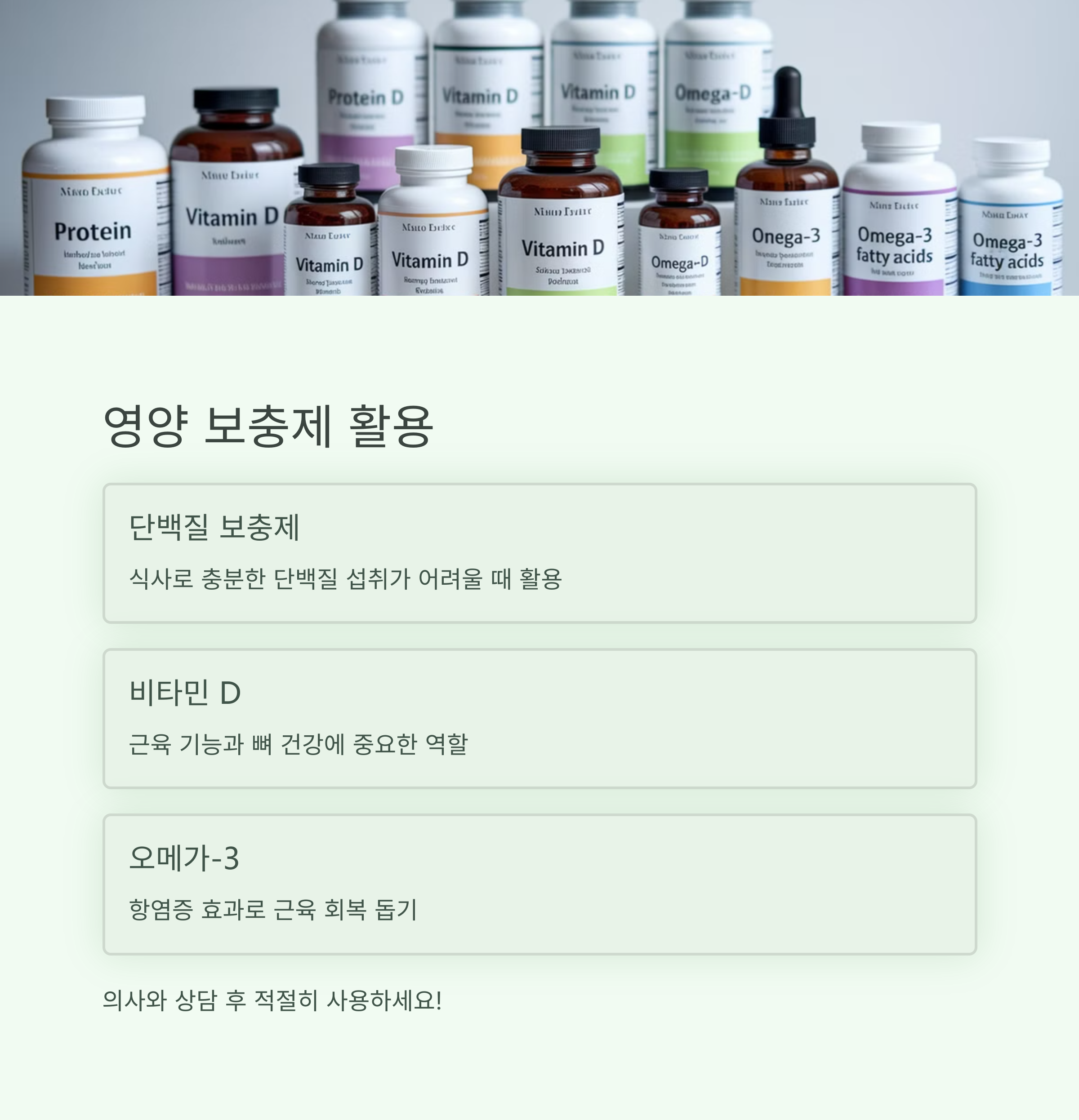 나이 들수록 근육을 유지하는 것은 건강한 노화를 위한 필수 요소입니다. 충분한 단백질 섭취와 함께 비타민 D, 칼슘, 오메가-3, 마그네슘 등의 보조 영양소를 균형 있게 섭취하는 것이 중요합니다.