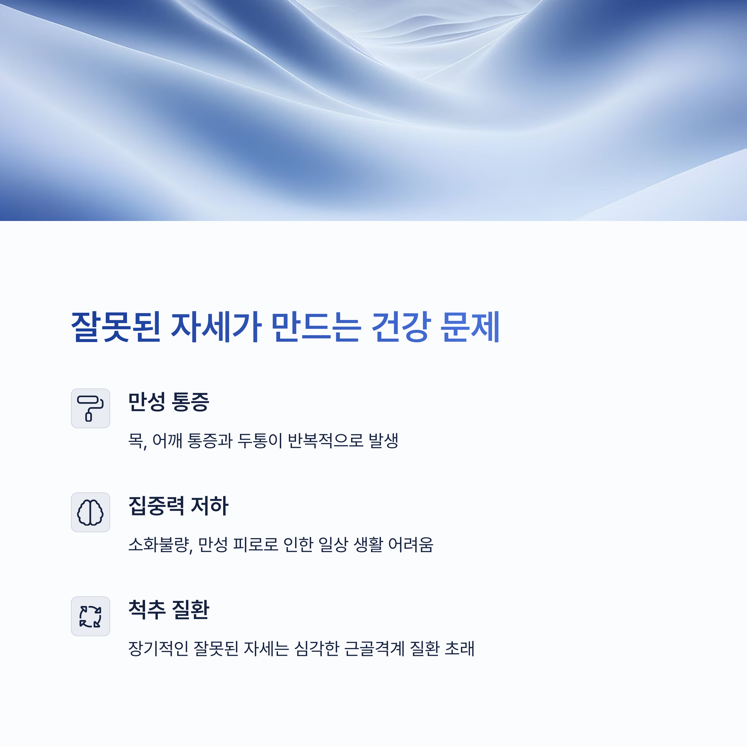 사실 바른 자세는 단순히 보기 좋은 것 이상의 의미가 있어요. 잘못된 자세가 지속되면 우리 몸에 여러 문제가 생길 수 있거든요. 목과 어깨 통증은 물론이고, 두통, 소화 불량, 집중력 저하까지... 진짜 심각하죠.