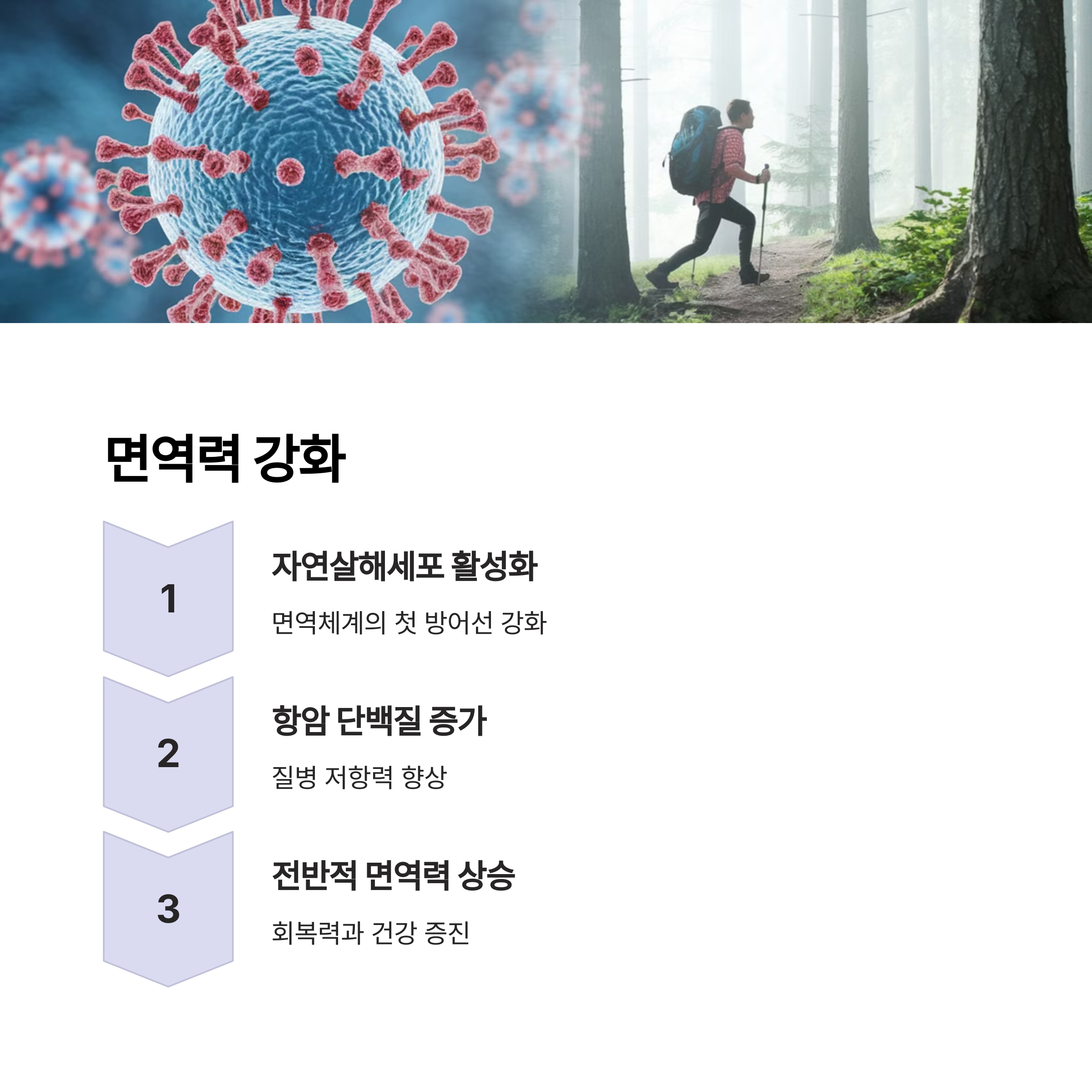 산림욕이 단순한 휴식이 아닌 과학적으로 입증된 건강법이라는 사실을 아시나요? 숲에는 '피톤치드'라는 특별한 물질이 있습니다. 피톤치드는 나무가 해충이나 병원균으로부터 자신을 보호하기 위해 분비하는 방어 물질로, 인체에 들어오면 면역세포인 NK세포(자연살해세포)의 활성도를 높여줍니다. 이 NK세포는 암세포와 바이러스에 감염된 세포를 제거하는 역할을 합니다.