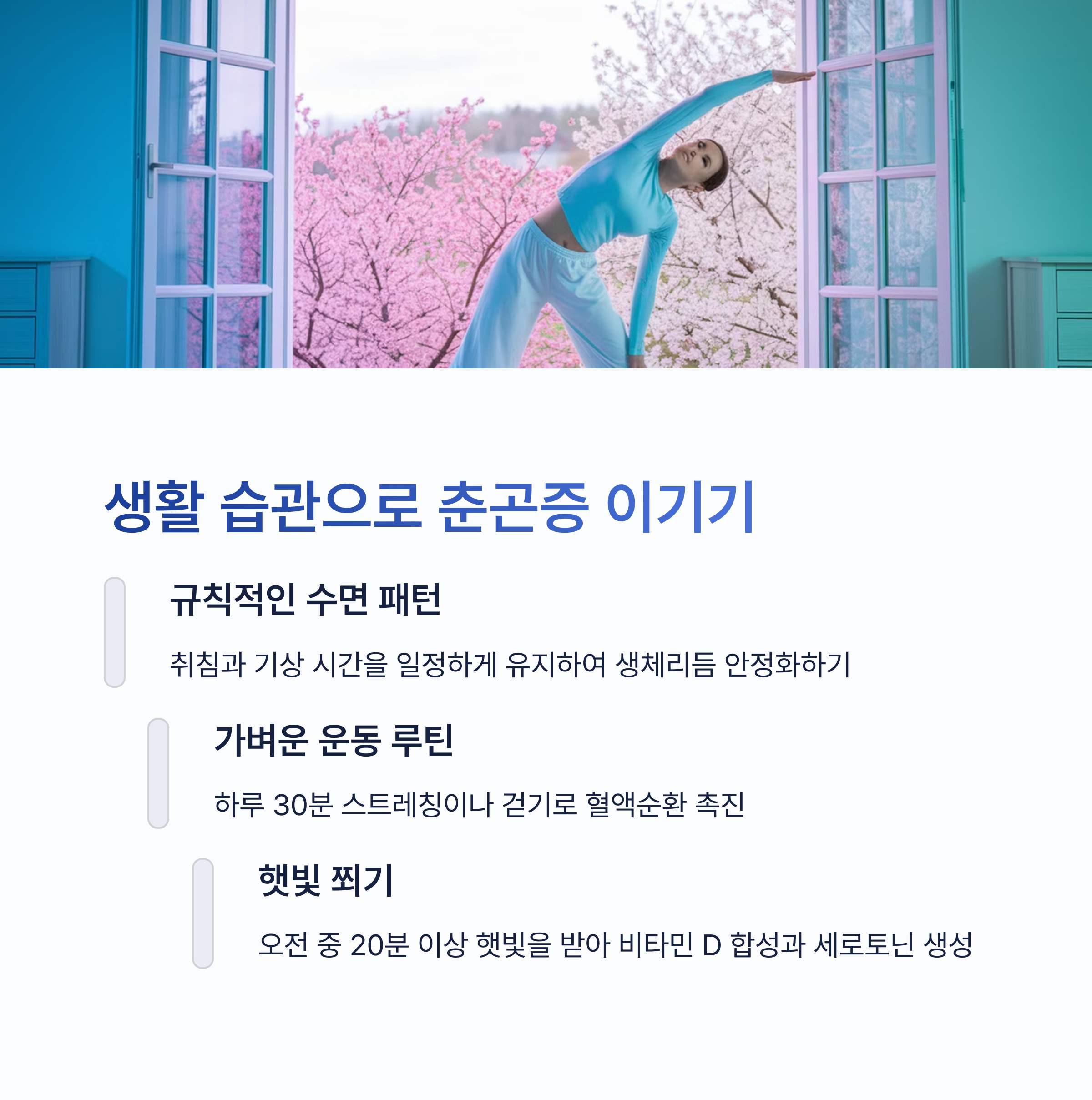 매일 같은 시간에 자고 일어나는 습관을 들이세요. 충분한 수면(7-8시간)은 춘곤증 극복의 기본입니다. 잠들기 전 스마트폰이나 TV 같은 전자기기 사용을 줄이고, 침실은 어둡고 조용하게 유지하는 것이 좋아요.